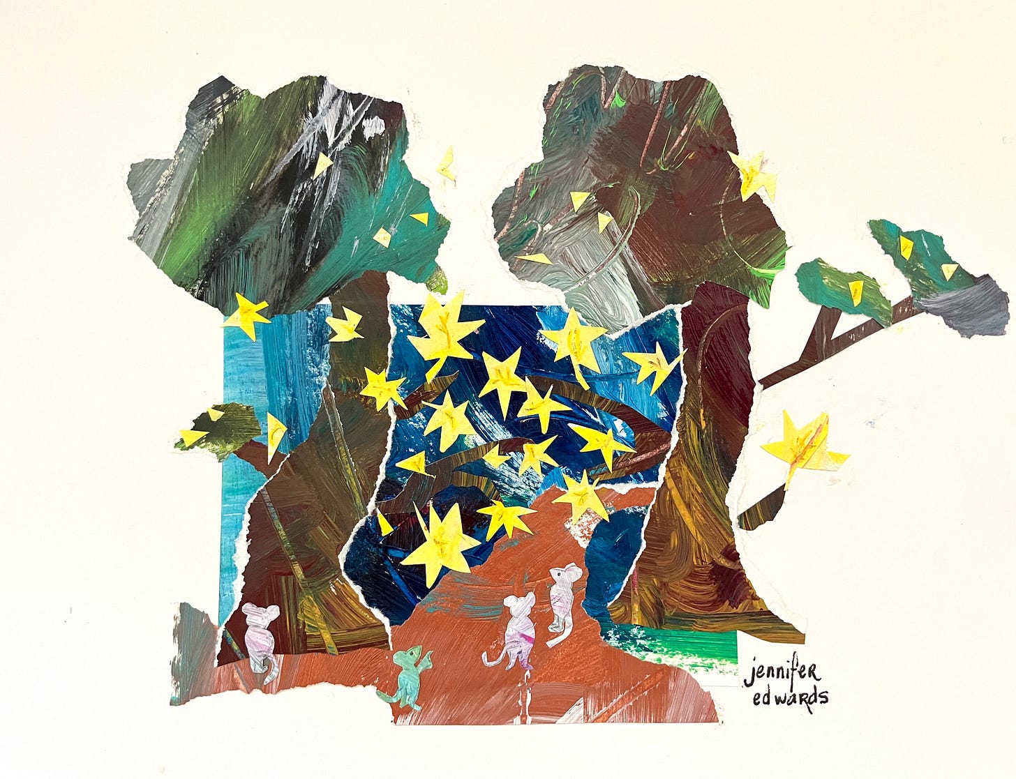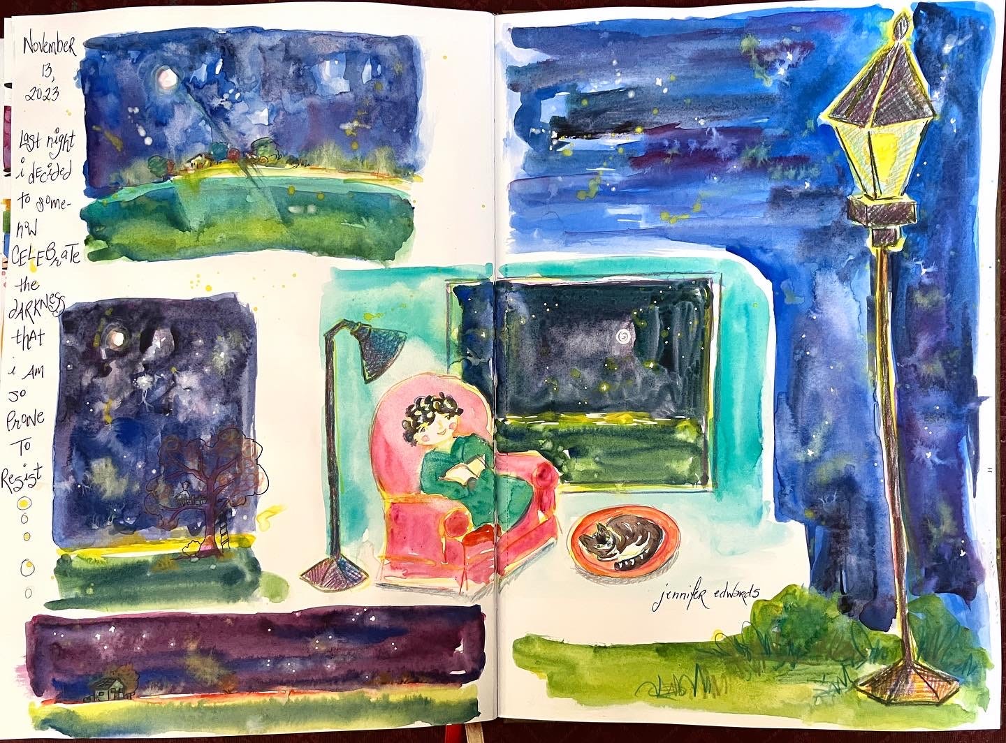 *I have made an intention to peer into the darkness outside as it visits us so much earlier now. This is actually in an effort to appreciate the darker days more than I have for most of my life. I love the light!! I love long sun-filled days! I don’t mind cold or snow…in fact I LOVE it! But the darkness is hard for me. So I am making little drawings or paintings or collages to try to describe the loveliness I see in the dark skies or how the streetlamps light up the night, or how golden leaves seem to twinkle like stars as I walk in the near-dark afternoon.