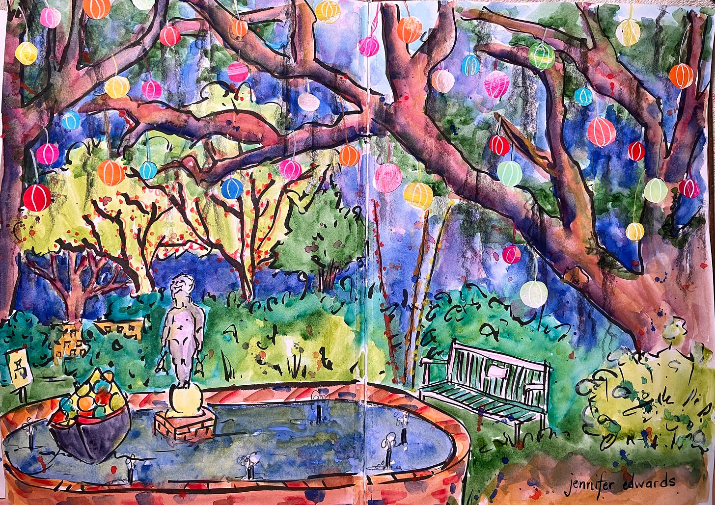 * I’ve been to Debordieu Colony in SC, visiting with a dear friend and have fallen in love once again with a most magnificent live oak in her back yard that reaches over her home with all its swaying mossy grace. We spent two days at Brookgreen Gardens which is surely now my most favorite place to visit on earth! Oh how I long to be a tree in that marvelous garden! I kept thinking how much I adore these old trees festooned with Spanish moss, so magical and unearthly they are in their silvery tresses! 2