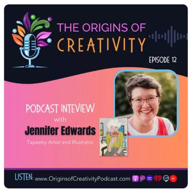 I’ll start by sharing the podcast, in hopes that if you too are snowed in, you might have a listen as Becky Gehrisch, whose podcast is The Origins of Creativity, interviews me asking some really lovely questions. We get into how tapestry weaving came to be in my life, its therapeutic power alongside spinning and drawing, how teaching has been a gift, the ways fiber arts ties us to history and other cultures, and how slow creative work teaches one to be in the moment. Becky and her husband have a heart for encouraging creative people of all kinds and I do hope you will enjoy all the other interviews — such fascinating artists and helpful points to glean from them. The link to listen to my interview is here.