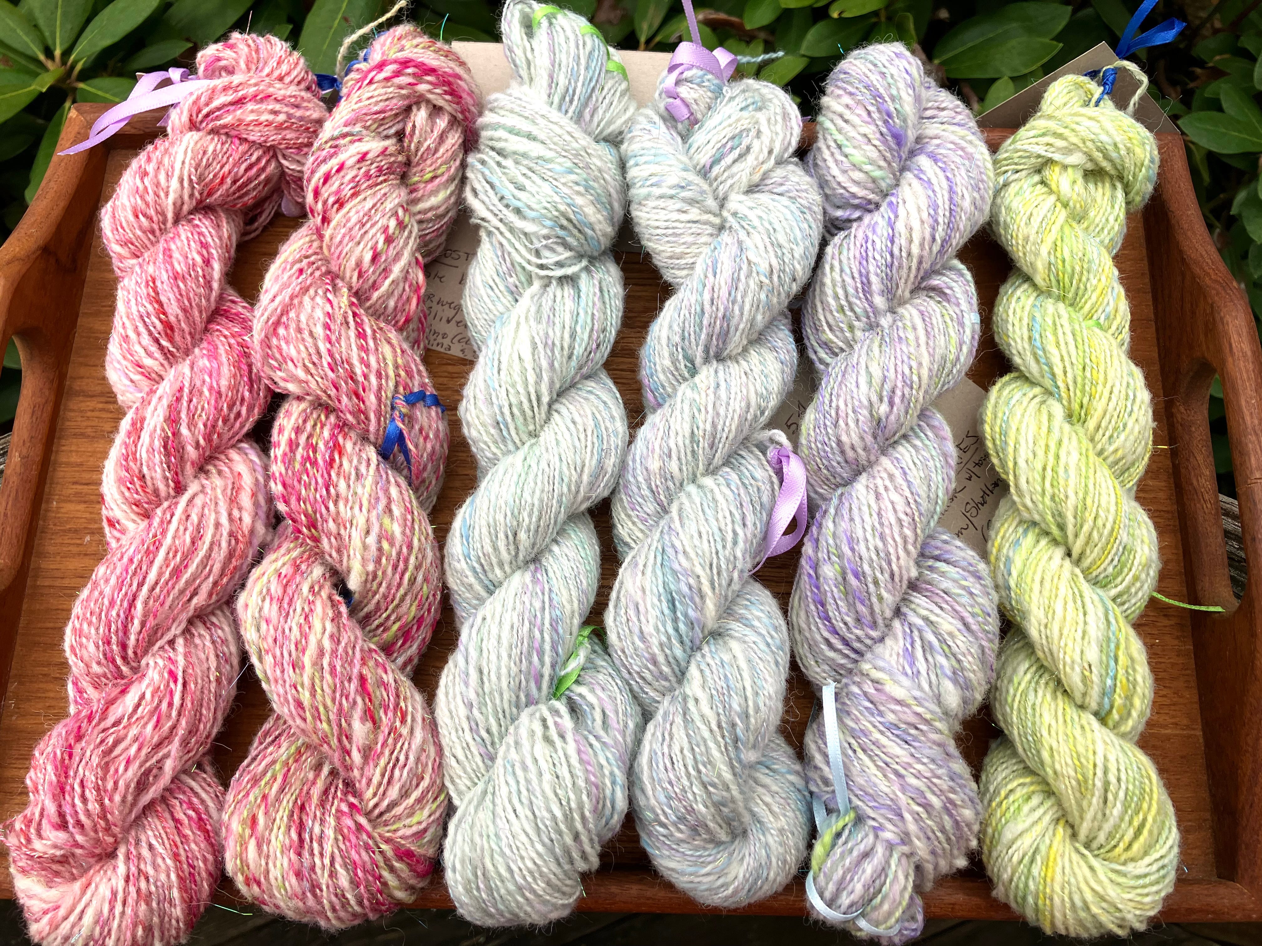 (Recently spun “Frost Series”. Blended them all with a generous amount of sparkle! I used the pale ice blue for the background yarn in the December Rabbit tapestry. 🥰)