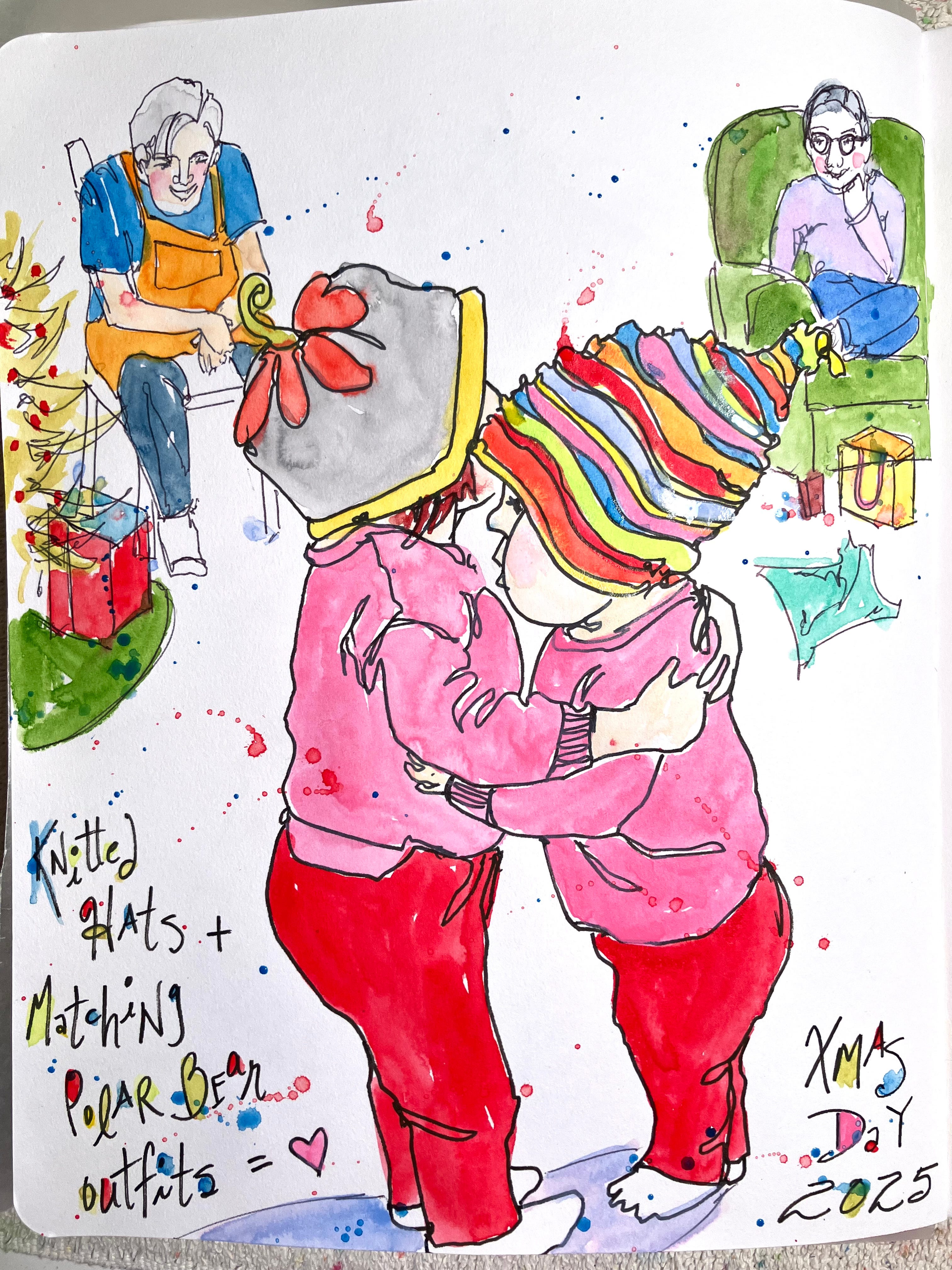 A highlight of Christmas was seeing our adorable grandgirls wearing their matching outfits that my husband and I had given to them, plus the hats I knitted for each of them from Susan B. Anderson patterns. They play together so well and give each other hugs — this Nonni’s heart just melts!