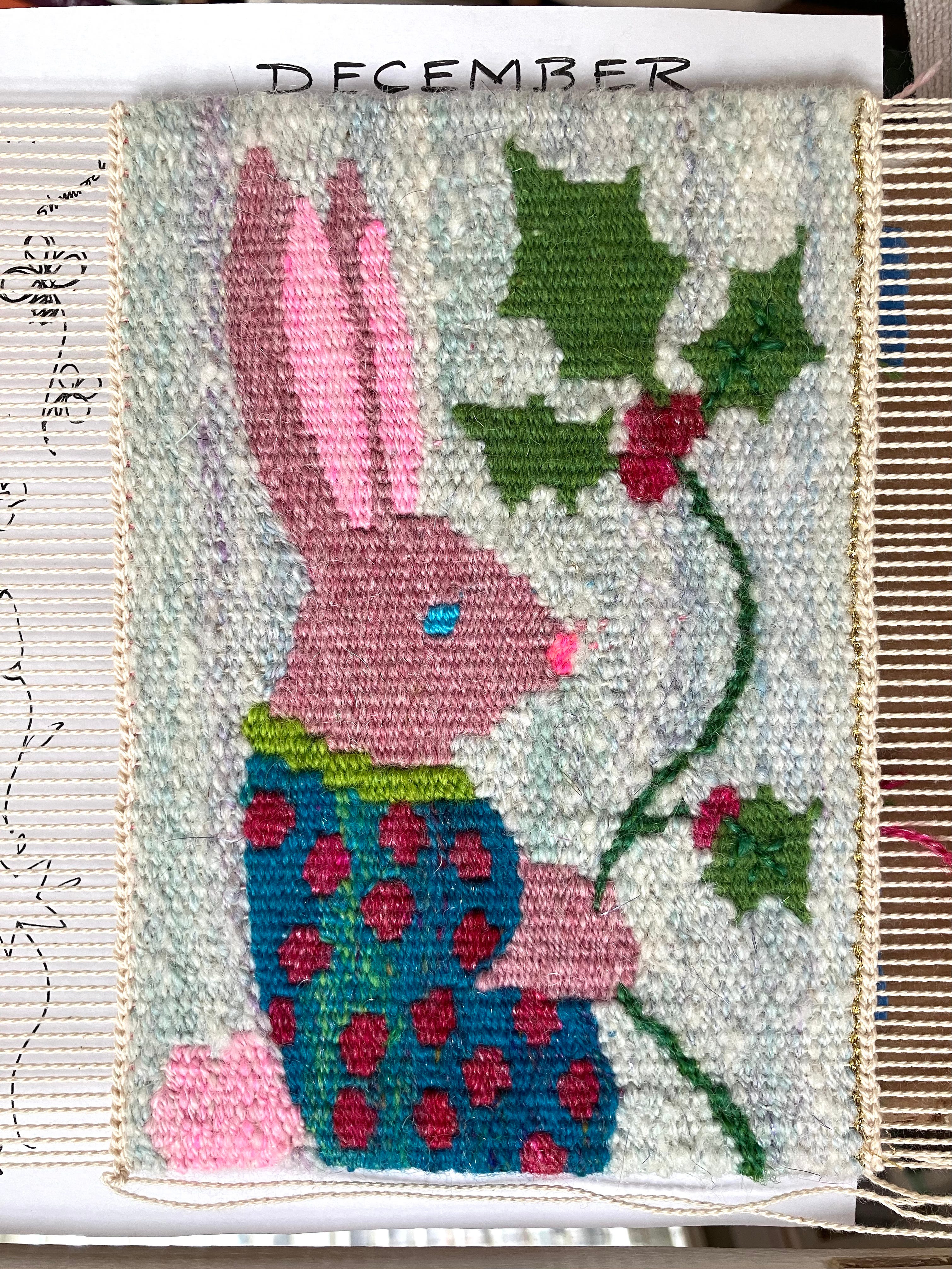 I have also been able to weave my tapestry rabbits2 this month in a fairly consistent manner. The last time I posted about the Rabbit Tapestries here on Substack, I think I had completed August. Now September, October, November and December are done! Well, at the time I’m sending this out to you, I only have the embroidered details left to do on December’s holly-toting bunny. I am truly sad to see this series end! But I’ve got plans for what is next so please stay tuned to see!